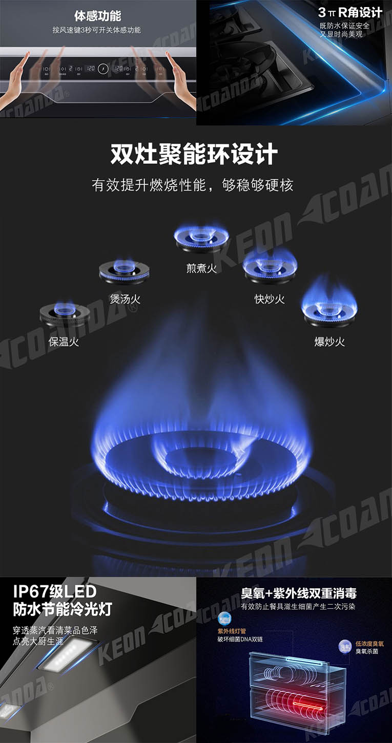 520告白季,科恩D520煙灶消款集成灶前來助陣,低空近吸體感操控,按風俗健3秒可開關體感功能,3πR角設計,既防水保證安全,又顯高端時尚,雙灶聚能環5.0KW強大火力,爆炒更有勁,煲湯更有味,1-99分鐘自由選擇,烹飪完成時自動熄火,開關紅外線2秒延時,防止了誤觸,同時產品采用一鍵自動清洗,減輕你美麗雙手負擔,內部一鍵自動清潔。消毒柜采用臭氧+紫外線雙重消毒,有效防止了餐具滋生細菌產生的二次污染,西門子冰箱門拉手,貼心高氧化鈦合金材質,耐用又好看!愛她,就要保護她,科恩D520集成灶,給她全方位的守護!