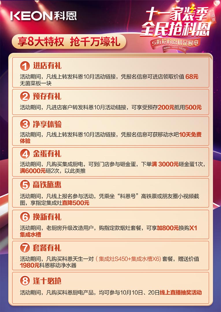 10月1日——10月23日,集成灶十大品牌、廚電行業十大品牌科恩集成灶“十一家裝季 全民搶科恩”活動開啟,終端活動玩法升級、福利加碼,打造金秋十月盛大福利狂歡盛宴,讓更多人能有機會享受到科恩集成灶十月活動帶來的福利。進店有禮、預存有禮、凈享體驗、金蛋有禮、高鐵旅惠、換新有禮、套餐有禮、逢十必搶豪禮巨獻。