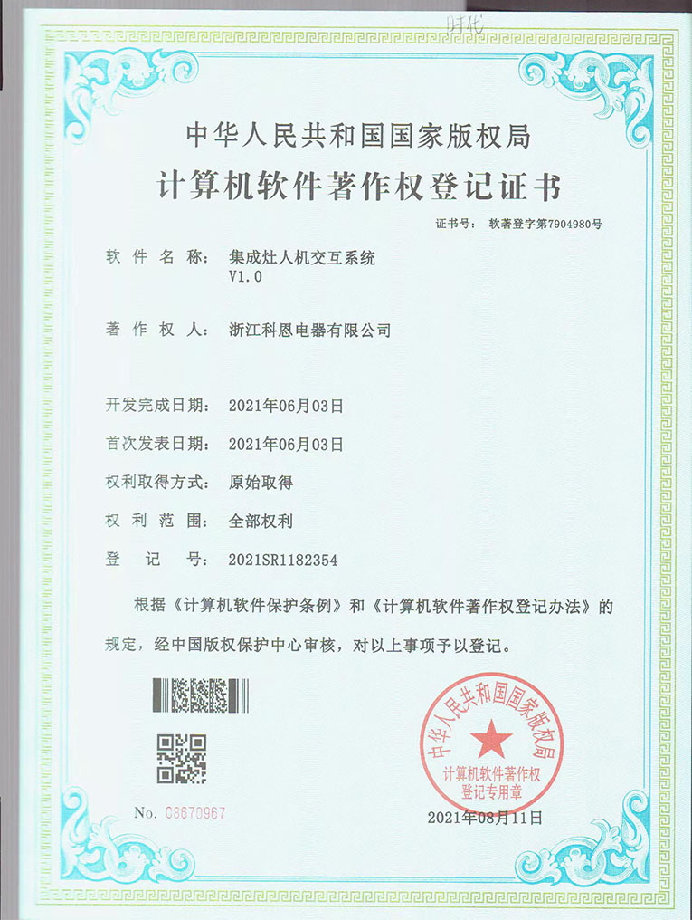 近日,由浙江科恩電器有限公司完全自主研發(fā)的集成灶人機交互系統(tǒng)V1.0軟件正式獲得國家版權(quán)局頒發(fā)的計算機軟件著作權(quán)登記證書。計算機軟件著作權(quán)是企業(yè)核心自主知識產(chǎn)權(quán),是企業(yè)的“無形資產(chǎn)”,是企業(yè)科技的生命力和價值所在。同時,國家權(quán)威部門的認證將使搭載這些軟件的產(chǎn)品價值倍增。此次集成灶十大品牌、廚電行業(yè)十大品牌科恩集成灶獲得計算機軟件著作權(quán),充分展現(xiàn)了企業(yè)強大的研發(fā)實力和核心競爭力。