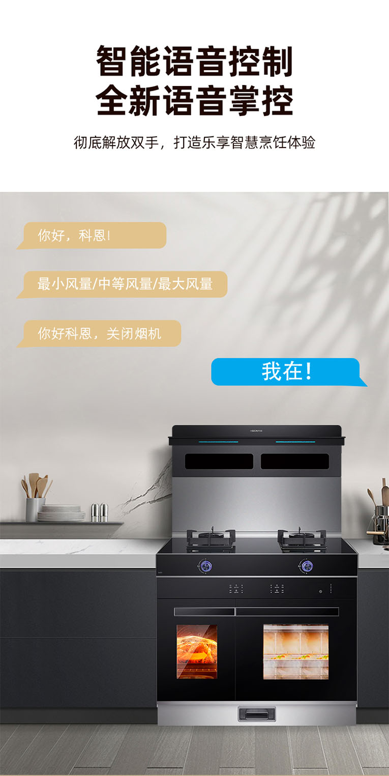 科恩S450變頻大吸力左右蒸烤集成灶擁有20m3/min大風(fēng)壓,智能變頻巡航增壓,同時搭載智能語音控制,“你好科恩”輕松喚醒,享受廚房潔凈生活,就選科恩大吸力。