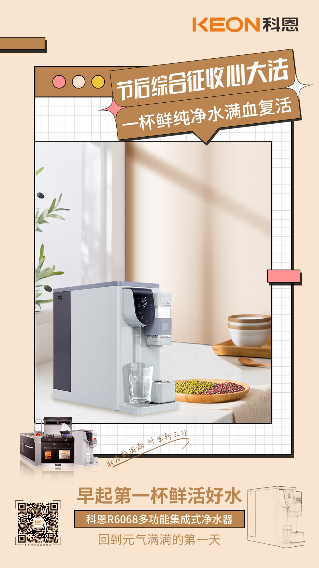 國慶長假,熬夜晚起定時常態(tài),你需要一杯鮮活好水,煥新身體細胞,回到元氣滿滿的第一天!科恩R6068多功能集成式凈水器,一鍵適配不同飲水需求,溫度水量皆可調控,百變泡飲,滴滴鮮醇,RO精濾,UV殺菌,精濾至微,暢飲無憂,健康隨行!