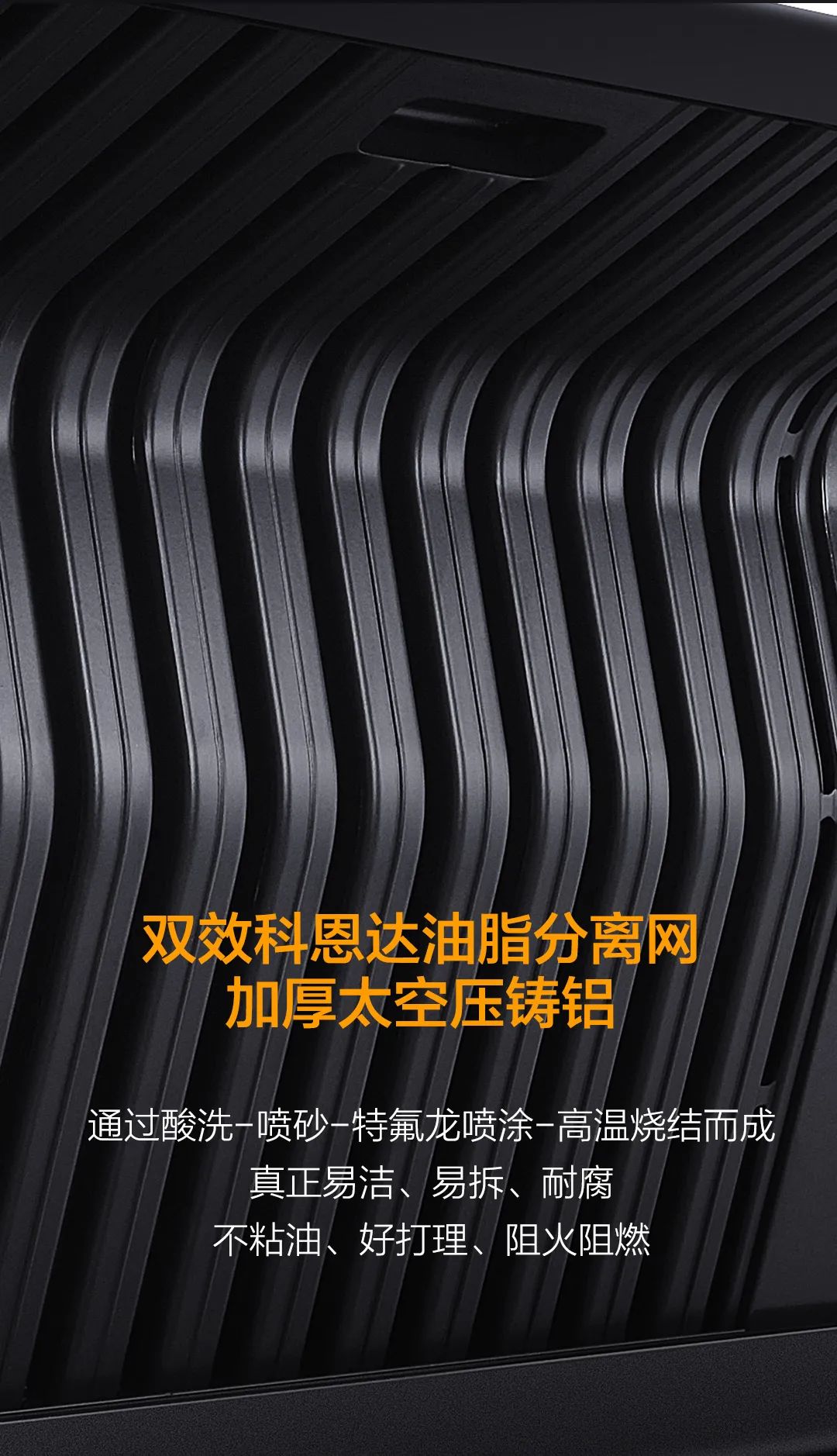 在工藝上經(jīng)過酸洗-噴砂工藝加之特氟龍噴涂最后高溫?zé)Y(jié),不僅不沾油、易清潔好打理。在分離油煙的同時,還能阻燃阻熱!保障廚房安全!