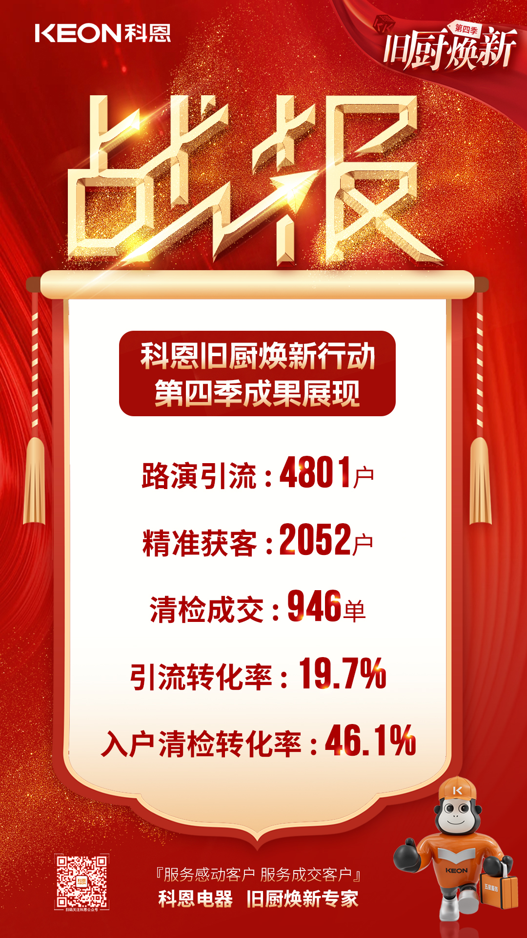 時至今日,為期20天的科恩“第四季舊廚煥新”活動已然結束。本次煥新活動路演精準引流4801戶,成交946單!轉化率高達46.1%!堪稱行業佳績!