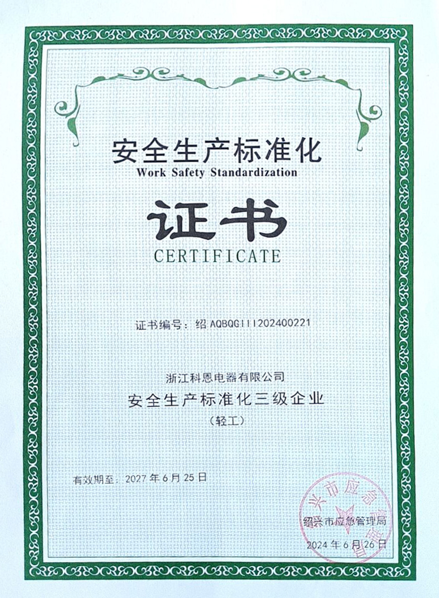 浙江科恩電器有限公司榮獲“安全生產標準化三級企業”榮譽,展現創新企業安全理念!