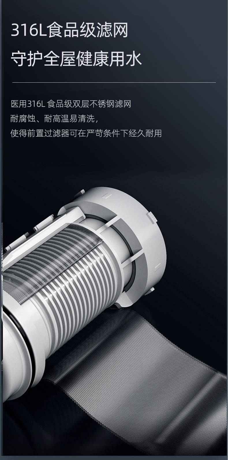 同時,Q30采用40um過濾精度,精密不銹鋼濾網,精度過濾泥沙、鐵銹、蟲卵等大顆粒雜質,提升水質,延長家電使用壽命,完美解決新小區洗衣機進砂石的煩惱。