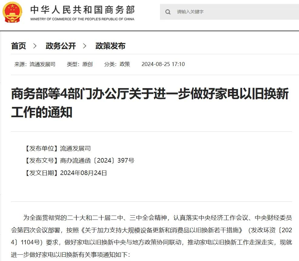 8月25日,商務(wù)部等4部門發(fā)布《關(guān)于進一步做好家電以舊換新工作的通知》,做好家電以舊換新中央與地方政策協(xié)同聯(lián)動,明確有關(guān)事項。