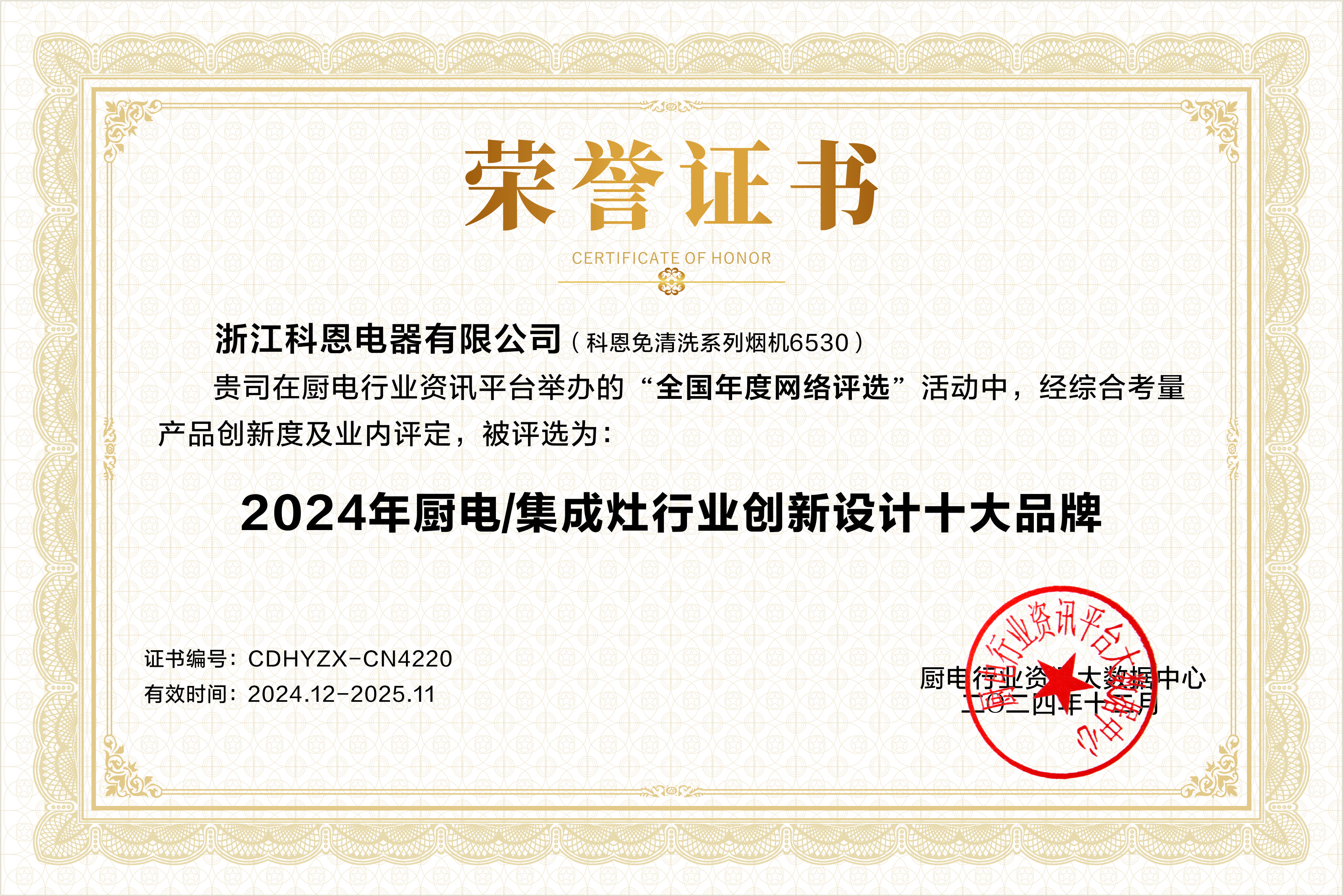 值得驕傲的是,在剛剛過去的2024年,科恩電器更是榮譽加身,榮獲了“2024年廚電行業影響力十大品牌、消費者好口碑十大品牌、廚電/集成灶創新設計十大品牌等稱號”。這些殊榮不僅是對科恩電器過去一年在產品研發、品牌建設、市場推廣以及客戶服務等方面所付出努力的高度肯定,更是為其在激烈的市場競爭中贏得了更多的話語權和競爭優勢。