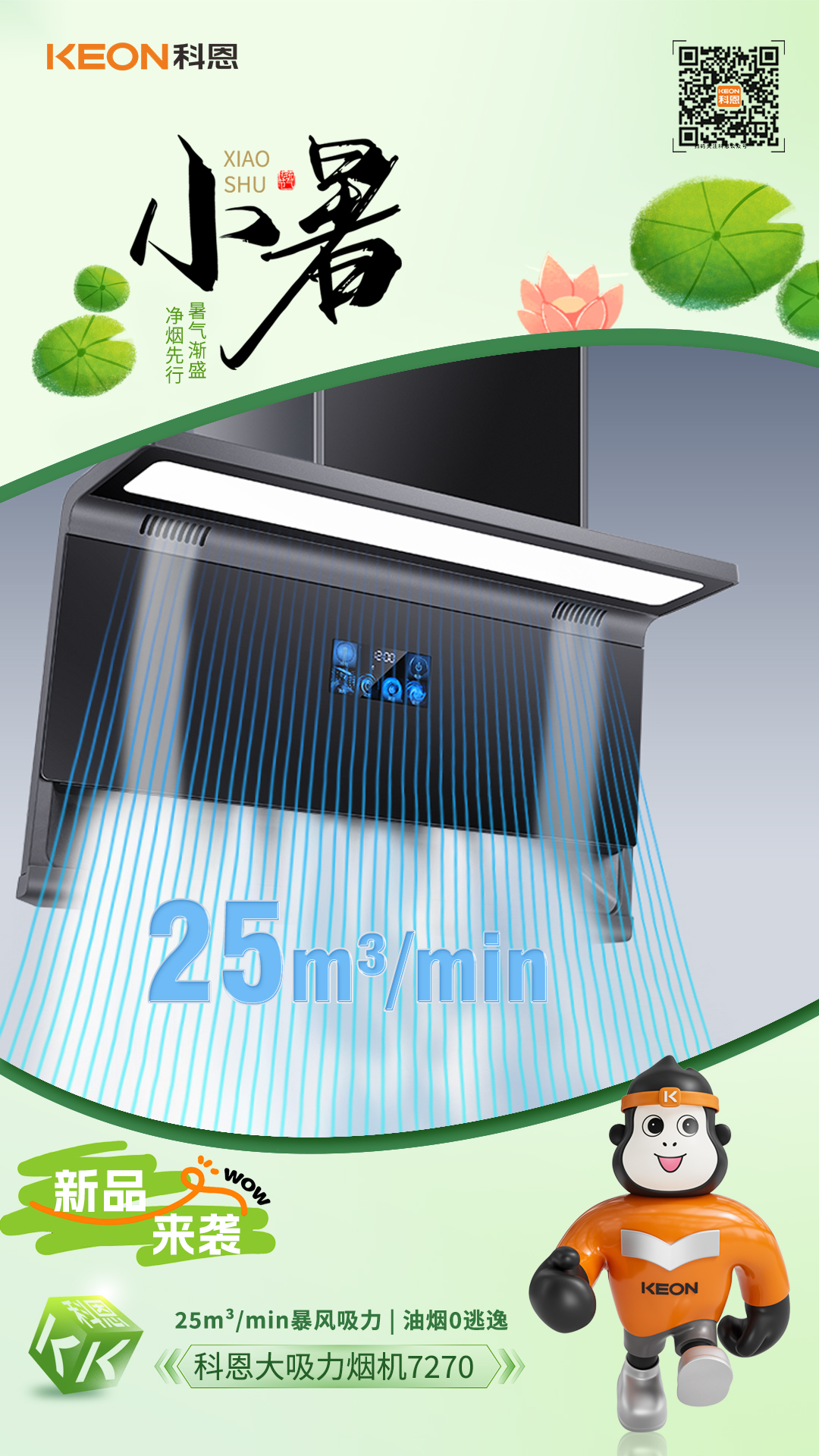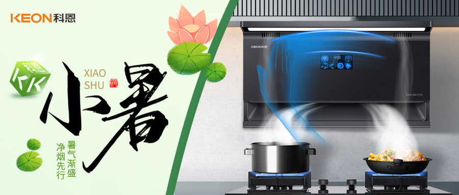 蟬鳴初起,熱浪翻涌。小暑時節廚房成高溫重災區,油煙升騰中包裹著暑氣更顯煩躁,科恩7270煙機攜25m³/min暴風吸力來襲,為廚房筑起清涼防線,讓凈煙快一步,生活慢享受。