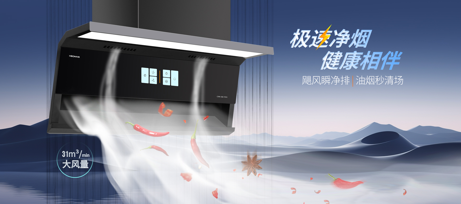 空間煥新,凈美廚房。舊煙機(jī)笨重占空間難適配,換新品怕拆櫥柜,2.5cm輕薄機(jī)身解你顧慮,冰川灰鑲邊適配多風(fēng)格,天鵝頸上仰設(shè)計(jì)釋放空間,烹飪操作從容坦蕩。爆炒濃煙,瞬吸凈場。辣椒入鍋油煙瞬間升騰,開放式廚房全家遭“煙熏”, 31m³/min大風(fēng)量強(qiáng)勢(shì)捕獲,1350Pa變頻風(fēng)壓破擁堵,高峰時(shí)段排煙依舊順暢,清新空氣常駐烹飪時(shí)光。全域攏煙,無隙可逃。吸力再大跑煙也枉然,895mm寬域控?zé)熤琳?/span>,負(fù)壓內(nèi)傾設(shè)計(jì)順勢(shì)直排,頂吸側(cè)吸協(xié)同發(fā)力,下層攏煙上層阻逃逸,輕重油煙全被精準(zhǔn)鎖定。