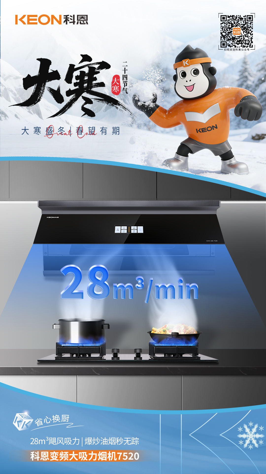 寒天煮暖,無(wú)煙煥新!大寒歲暮天寒,廚房煙火正濃!舊機(jī)排煙乏力,油煙裹寒?dāng)_人,科恩7520登場(chǎng),解鎖暖冬烹飪新境。櫥柜零改即裝,油煙轉(zhuǎn)瞬無(wú)蹤,讓寒日下廚,只剩鮮香不見煙。