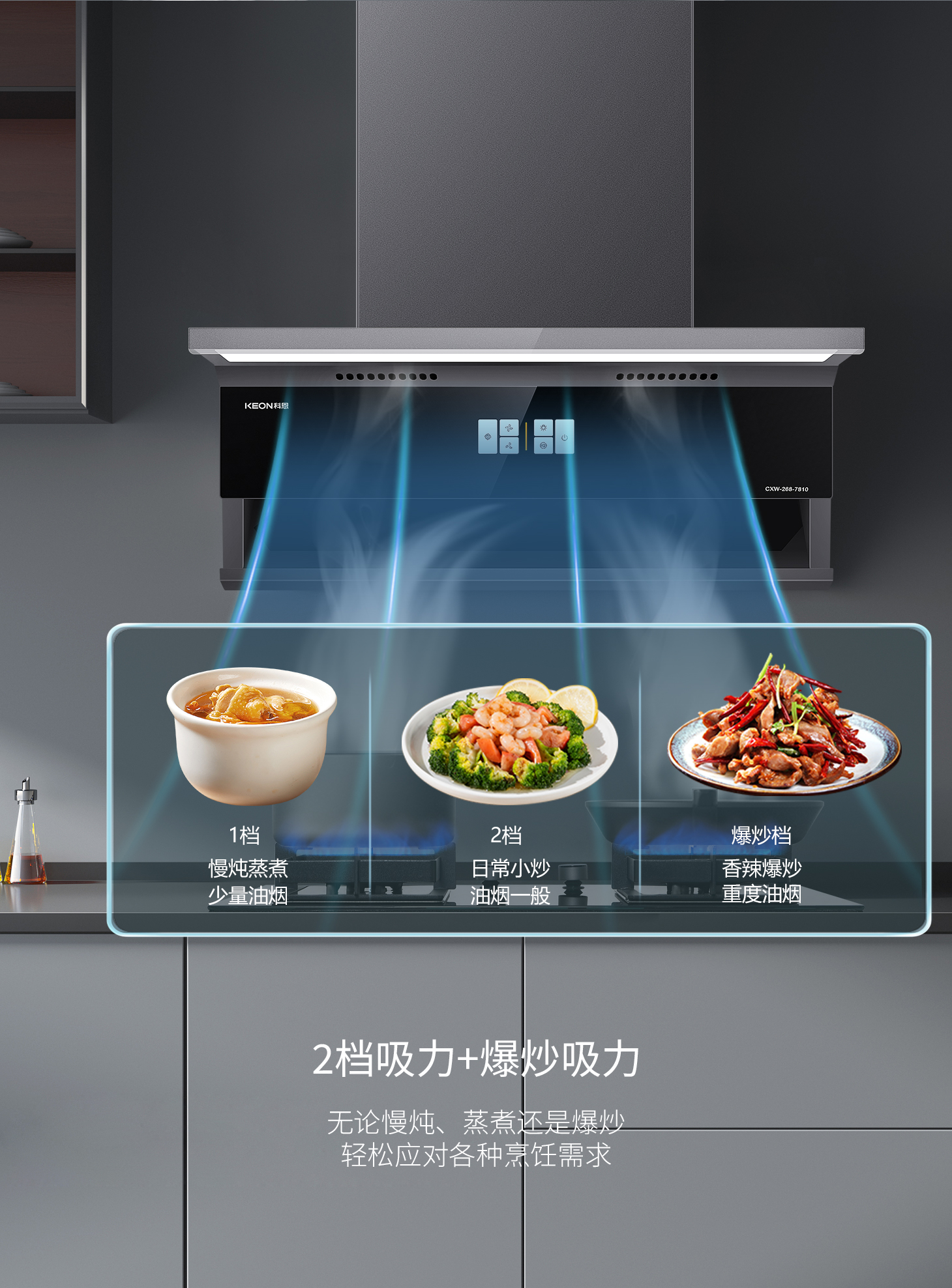 凈煙神速 顏值擔當。新年爆炒,油煙無蹤,3秒清場,全域攏煙,1350Pa變頻風壓,排煙順暢。2.5cm輕薄機身,冰川灰鑲邊,天鵝頸設計,釋放開闊空間,揮手智控,凈煙不沾油污。易潔省心 健康相伴。特氟龍工藝,油污不粘。智旋清洗,吸力持久強勁。3分鐘延時關機,余煙盡除,IP67全景天幕,護眼清晰,模塊化觸控,操作直觀簡單,0.5立方大空間,翻炒不碰頭。