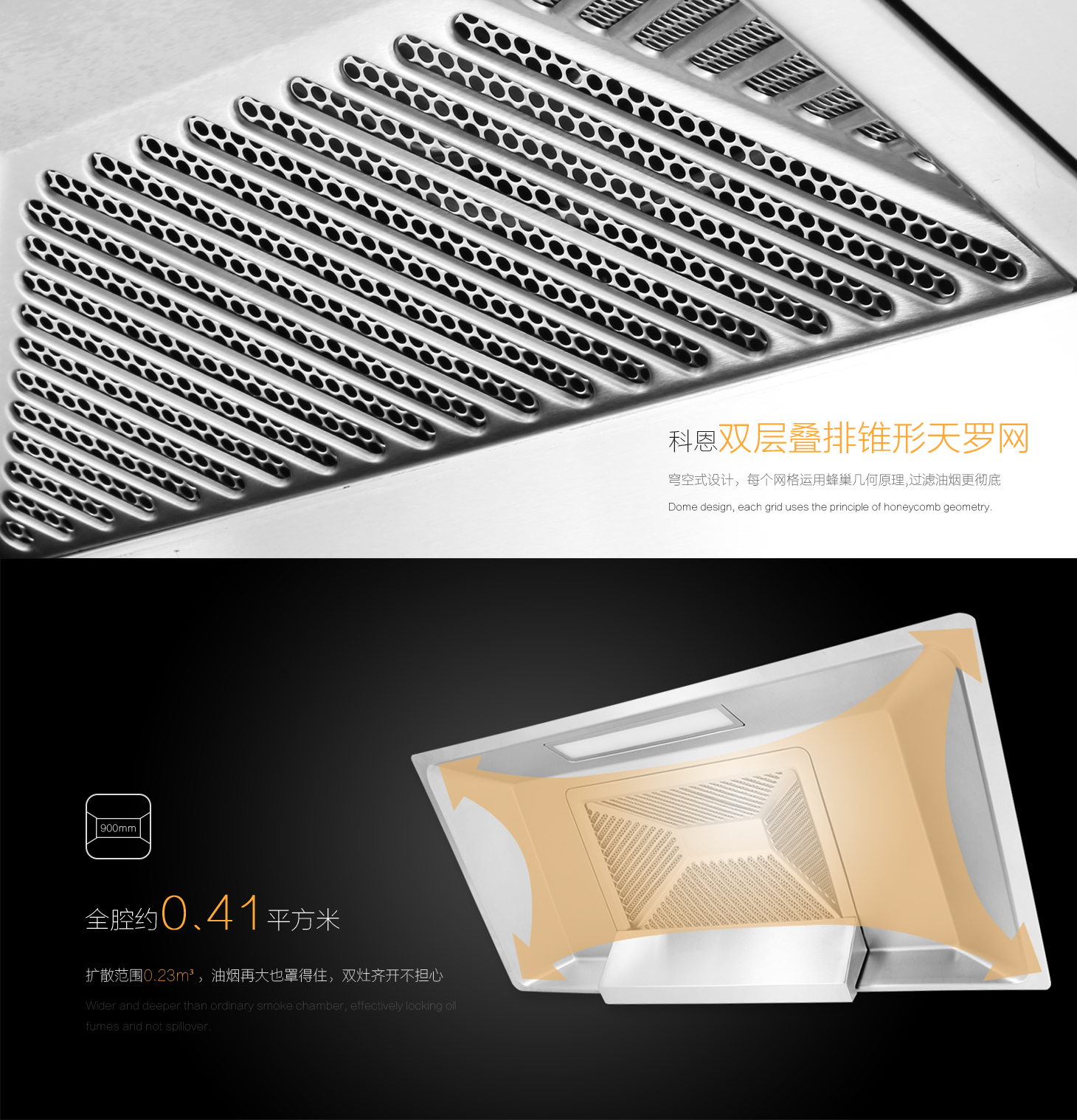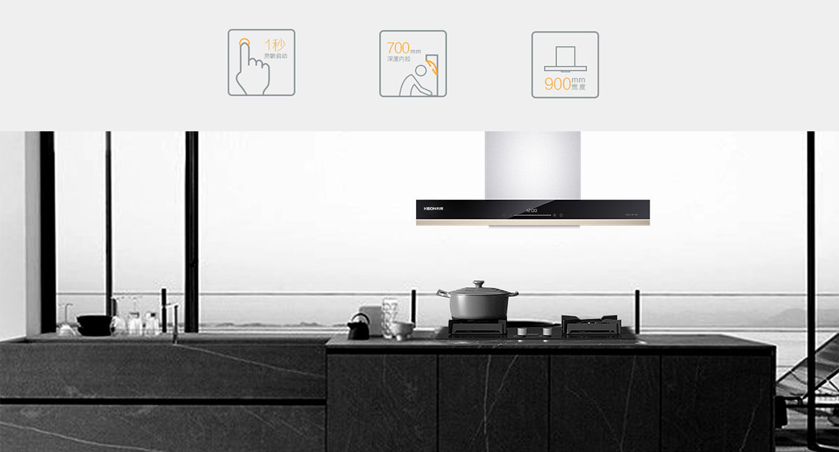 全腔900MM攏煙區,比普通煙腔更寬更深,有效鎖住油煙不外溢。