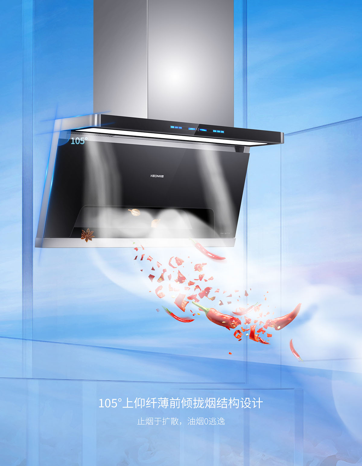 • 105°仰角攏煙設計,瘦身大空間,翻炒不碰頭